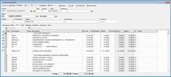 Nel preventivo si può specificare gli Articoli previsti (materiali e mano d’opera) e digitare la descrizione del lavoro. Ad ogni singolo rigo del preventivo è possibile imputare il Prezzo di Costo (Prz.Costo) per calcolare il margine previsto del preventivo.