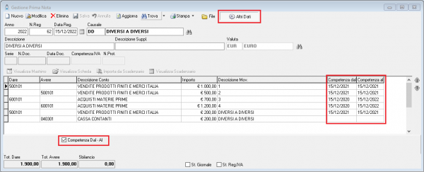 Entrando in una registrazione in prima nota e cliccando in alto nel pulsante “Altri Dati” sì abilita la possibilità di fleggare la opzione “Competenza Dal-Al”, in questo modo vengono aggiunte le colonne di tipo data “Competenza dal” e “Competenza al”.