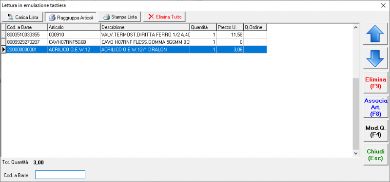 Quando si chiude la finestra tutti i barcode presenti vengono importati nel documento, facendo scattare i controlli che scattano solitamente quando si crea un nuovo rigo.