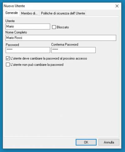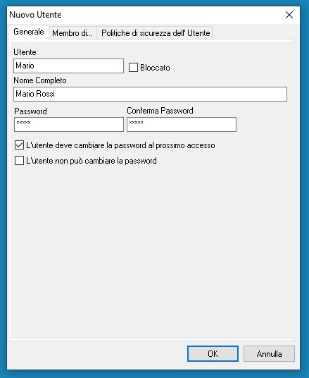E' consigliabile, in caso di creazione di più Utenti, di selezionare la voce 'l'utente deve cambiare la password al primo accesso' e inserire una Password provvisoria per ragioni di riservatezza.