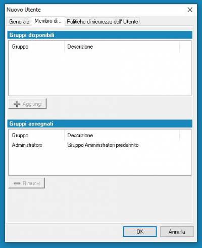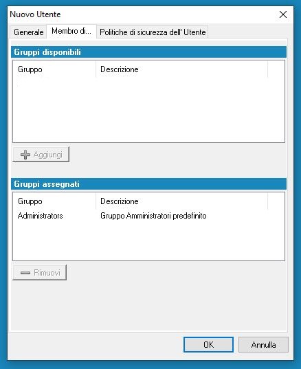 È opportuno configurare almeno un utente che rivestirà il ruolo di Amministratore assegnandolo al gruppo Administrators. Le credenziali dell'utente Administrator non devono essere utilizzate.