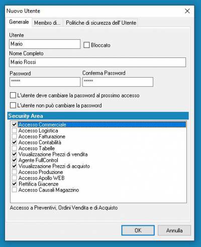 Con il modulo Security l'Amministratore potrà decidere quali Utenti possono accedere a determinate aree di Apollo (es. Commerciale, Fatturazione, Logistica, ecc) cliccando sul quadratino corrispondente.